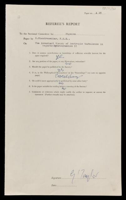 Geoffrey Ingram Taylor, Referee's report by Geoffrey Ingram Taylor, on a paper 'The invariant theory of isotropic turbulence in magneto-hydrodynamics. II' by Sivaramakrishna Chandrasekhar, 1951, RR/75/32, The Royal Society Archives, London, https://makingscience.royalsociety.org/items/rr_75_32/referees-report-by-geoffrey-ingram-taylor-on-a-paper-the-invariant-theory-of-isotropic-turbulence-in-magneto-hydrodynamics-ii-by-sivaramakrishna-chandrasekhar, accessed on 11 November 2025
