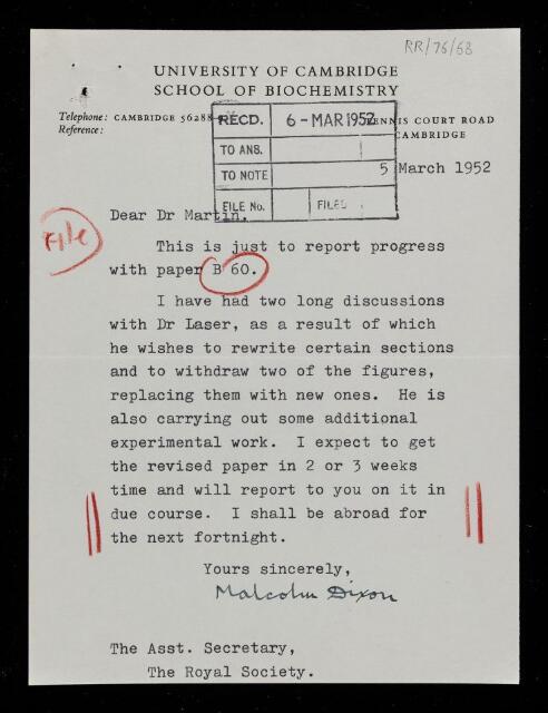 Dixon writes: 'Dear Dr Martin, This is just to report progress with paper B 60. I have had two long discussions with Dr Laser, as a result of which he wishes to rewrite certain sections and to withdraw two of the figures, replacing them with new ones. He is also carrying out some additional experimental work. I expect to get the revised paper in 2 or 3 weeks time and will report to you on it in due course. I sha;; be abroad for the next fortnight. Yours sincerely, Malcolm Dixon'.