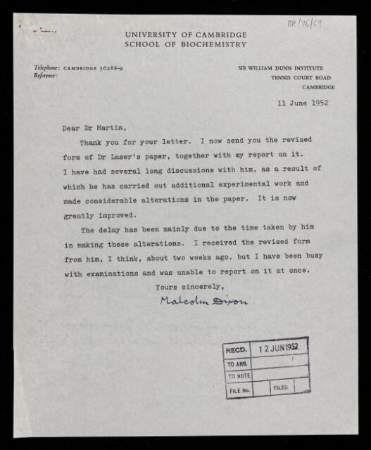 Malcolm Dixon, Letter from Malcolm Dixon, on a paper 'The effect of low oxygen tension on the activity of aerobic dehydrogenases' by H Laser, to D C Martin, 11 June 1952, RR/76/69, The Royal Society Archives, London, https://makingscience.royalsociety.org/items/rr_76_69/letter-from-malcolm-dixon-on-a-paper-the-effect-of-low-oxygen-tension-on-the-activity-of-aerobic-dehydrogenases-by-h-laser-to-d-c-martin, accessed on 24 January 2026