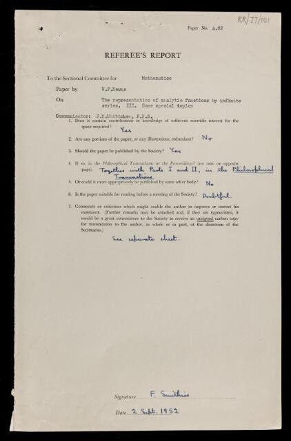 Referee's report by Frank Smithies, on a paper 'The representation of analytic functions by infinite series. III. Some special topics' by W F Newns, 02 August 1952, RR/77/101, The Royal Society Archives, London, https://makingscience.royalsociety.org/items/rr_77_101/referees-report-by-frank-smithies-on-a-paper-the-representation-of-analytic-functions-by-infinite-series-iii-some-special-topics-by-w-f-newns, accessed on 24 January 2026