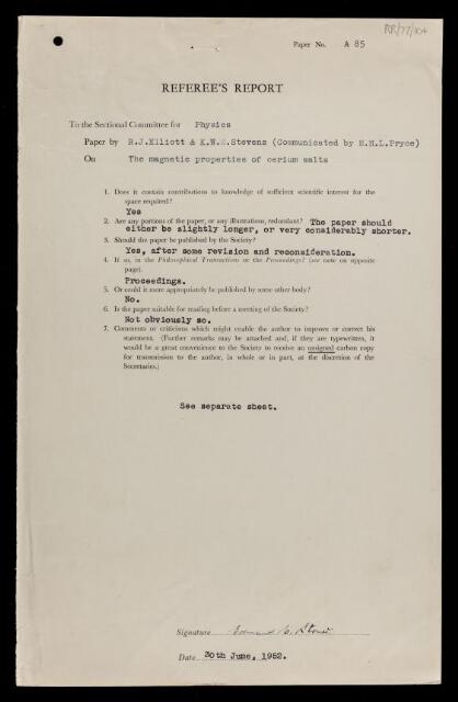 Edmund Clifton Stoner, Referee's report by Edmund Clifton Stoner, on a paper 'The magnetic properties of cerium salts' by Roger James Elliott and K W H Stevens, 30 June 1952, RR/77/104, The Royal Society Archives, London, https://makingscience.royalsociety.org/items/rr_77_104/referees-report-by-edmund-clifton-stoner-on-a-paper-the-magnetic-properties-of-cerium-salts-by-roger-james-elliott-and-k-w-h-stevens, accessed on 12 December 2025