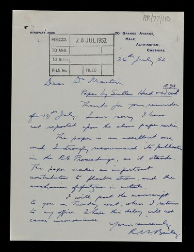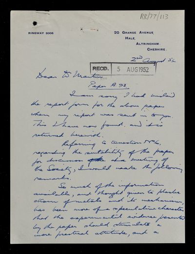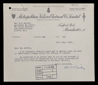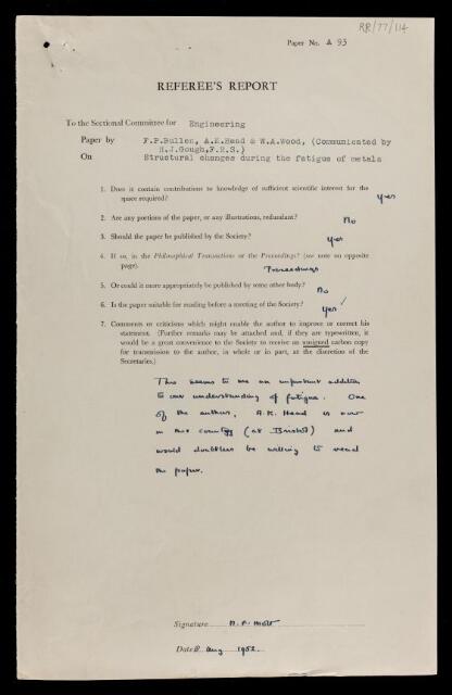 Nevill Francis Mott, Referee's report by Nevill Francis Mott, on a paper 'Structural changes during the fatigue of metals' by F P Bullen, Alan Kenneth Head and W A Wood, 08 August 1952, RR/77/114, The Royal Society Archives, London, https://makingscience.royalsociety.org/items/rr_77_114/referees-report-by-nevill-francis-mott-on-a-paper-structural-changes-during-the-fatigue-of-metals-by-f-p-bullen-alan-kenneth-head-and-w-a-wood, accessed on 14 January 2026