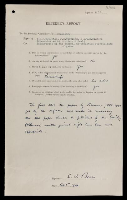 Edmund John Bowen, Referee's report by Edmund John Bowen, on a paper 'Measurement of the thermal accommodation coefficients of gases' by A J E Eggleton, Frederick Clifford Tompkins and D W B Wanford, 01 February 1952, RR/77/12, The Royal Society Archives, London, https://makingscience.royalsociety.org/items/rr_77_12/referees-report-by-edmund-john-bowen-on-a-paper-measurement-of-the-thermal-accommodation-coefficients-of-gases-by-a-j-e-eggleton-frederick-clifford-tompkins-and-d-w-b-wanford, accessed on 15 March 2026