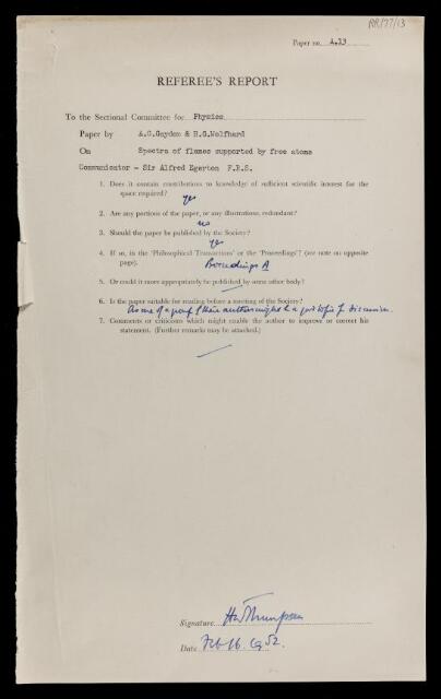 Harold Warris Thompson, Referee's report by Harold Warris Thompson, on a paper 'Spectra of flames supported by free atoms' by Alfred Gordon Gaydon and H G Wolfhard, 16 February 1952, RR/77/13, The Royal Society Archives, London, https://makingscience.royalsociety.org/items/rr_77_13/referees-report-by-harold-warris-thompson-on-a-paper-spectra-of-flames-supported-by-free-atoms-by-alfred-gordon-gaydon-and-h-g-wolfhard, accessed on 15 January 2026