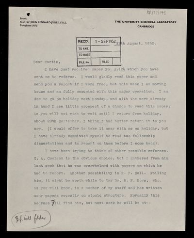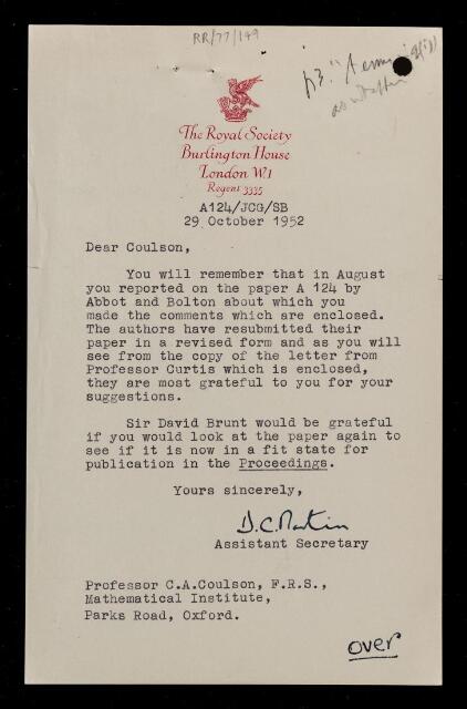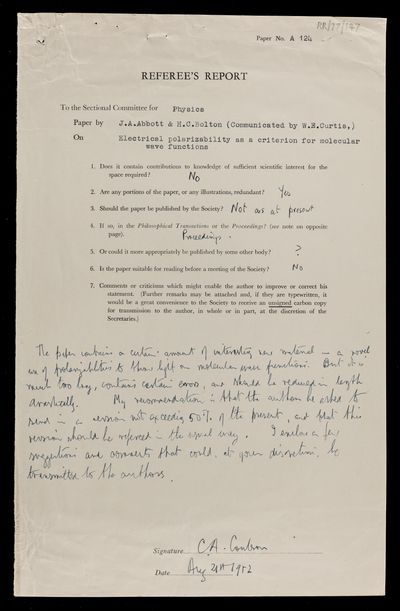 Charles Alfred Coulson, Letter from D C Martin to Charles Alfred Coulson, with Coulson's reply, concerning a paper 'Electrical polarizability as a criterion for molecular wave functions' by J A Abbott and H C Bolton, 29 October 1952, RR/77/149, The Royal Society Archives, London, https://makingscience.royalsociety.org/items/rr_77_149/letter-from-d-c-martin-to-charles-alfred-coulson-with-coulsons-reply-concerning-a-paper-electrical-polarizability-as-a-criterion-for-molecular-wave-functions-by-j-a-abbott-and-h-c-bolton, accessed on 13 March 2026