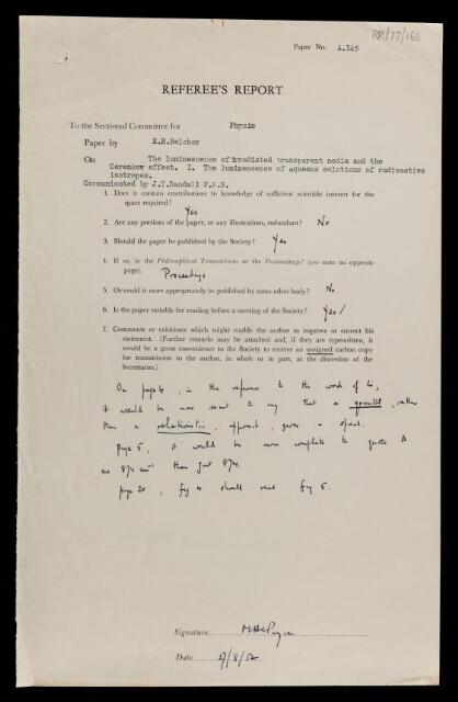 https://makingscience.royalsociety.org/items/rr_77_166/referees-report-by-maurice-henry-lecorney-pryce-on-a-paper-the-luminescence-of-irradiated-transparent-media-and-the-cerenkov-effect-i-the-luminescence-of-aqueous-solutions-of-radioactive-isotopes-by-e-h-belcher
