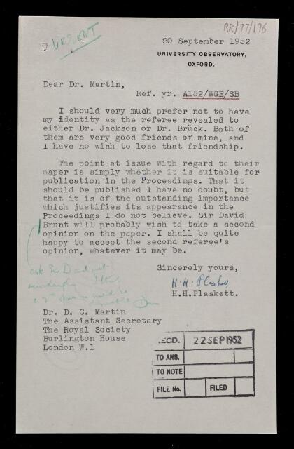 Harry Hemley Plaskett, Letter from Harry Hemley Plaskett, on a paper 'An attempt to measure interferometrically the widths of chromospheric lines at the total solar eclipse of 1952 February 25' by H A Brück and Derek Ainslie Jackson, to D C Martin, assistant secretary of the Royal Society, 20 September 1952, RR/77/176, The Royal Society Archives, London, https://makingscience.royalsociety.org/items/rr_77_176/letter-from-harry-hemley-plaskett-on-a-paper-an-attempt-to-measure-interferometrically-the-widths-of-chromospheric-lines-at-the-total-solar-eclipse-of-1952-february-25-by-h-a-brück-and-derek-ainslie-jackson-to-d-c-martin-assistant-secretary-of-the-royal-society, accessed on 15 February 2026
