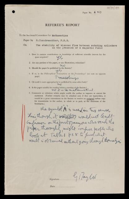 Geoffrey Ingram Taylor, Referee's report by Geoffrey Ingram Taylor, on a paper 'The stability of viscous flow between rotating cylinders in the presence of a magnetic field' by Subrahmanyan Chandrasekhar, 1952, RR/77/189, The Royal Society Archives, London, https://makingscience.royalsociety.org/items/rr_77_189/referees-report-by-geoffrey-ingram-taylor-on-a-paper-the-stability-of-viscous-flow-between-rotating-cylinders-in-the-presence-of-a-magnetic-field-by-subrahmanyan-chandrasekhar, accessed on 24 January 2026