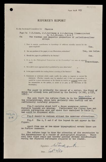 Willie Sucksmith, Referee's report by Willie Sucksmith, on a paper 'The thermal and magnetic properties of palladium-silver alloys' by F E Hoare, J C Matthews and J C Walling, 11 October 1952, RR/77/193, The Royal Society Archives, London, https://makingscience.royalsociety.org/items/rr_77_193/referees-report-by-willie-sucksmith-on-a-paper-the-thermal-and-magnetic-properties-of-palladium-silver-alloys-by-f-e-hoare-j-c-matthews-and-j-c-walling, accessed on 10 February 2026