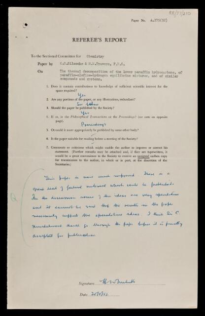 Harry Work Melville, Referee's report by Harry Work Melville, on a paper 'The thermal decomposition of normal paraffin hydrocarbons' by C G Silcocks and Morris William Travers, 20 August 1953, RR/77/210, The Royal Society Archives, London, https://makingscience.royalsociety.org/items/rr_77_210/referees-report-by-harry-work-melville-on-a-paper-the-thermal-decomposition-of-normal-paraffin-hydrocarbons-by-c-g-silcocks-and-morris-william-travers, accessed on 21 January 2026