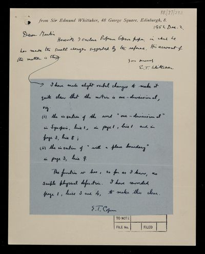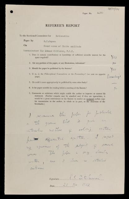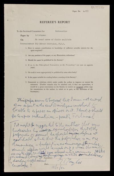 Edward Charles Titchmarsh, Referee's report by Edward Charles Titchmarsh, on a paper 'On sound waves of finite amplitude' by E T Copson, 25 November 1952, RR/77/231, The Royal Society Archives, London, https://makingscience.royalsociety.org/items/rr_77_231/referees-report-by-edward-charles-titchmarsh-on-a-paper-on-sound-waves-of-finite-amplitude-by-e-t-copson, accessed on 10 November 2025