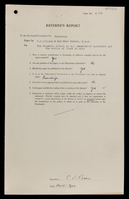 Edmund John Bowen, Referee's report by [Edmund John] Bowen, on a paper 'The Bequerel effect in the presence of dyestuffs and the action of light on dyes' by P J Hillson and Sir Eric Rideal, 15 November 1952, RR/77/236, The Royal Society Archives, London, https://makingscience.royalsociety.org/items/rr_77_236/referees-report-by-edmund-john-bowen-on-a-paper-the-bequerel-effect-in-the-presence-of-dyestuffs-and-the-action-of-light-on-dyes-by-p-j-hillson-and-sir-eric-rideal, accessed on 15 January 2026