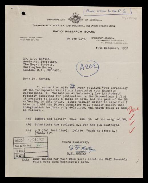 Letter from David Forbes Martyn, on a paper 'The morphology of the ionospheric variations associated with magnetic disturbance. I. Variations at moderately low latitudes' by David Forbes Martyn, to D C Martin, assistant secretary of the Royal Society, 11 December 1952, RR/77/238, The Royal Society Archives, London, https://makingscience.royalsociety.org/items/rr_77_238/letter-from-david-forbes-martyn-on-a-paper-the-morphology-of-the-ionospheric-variations-associated-with-magnetic-disturbance-i-variations-at-moderately-low-latitudes-by-david-forbes-martyn-to-d-c-martin-assistant-secretary-of-the-royal-society, accessed on 25 January 2026