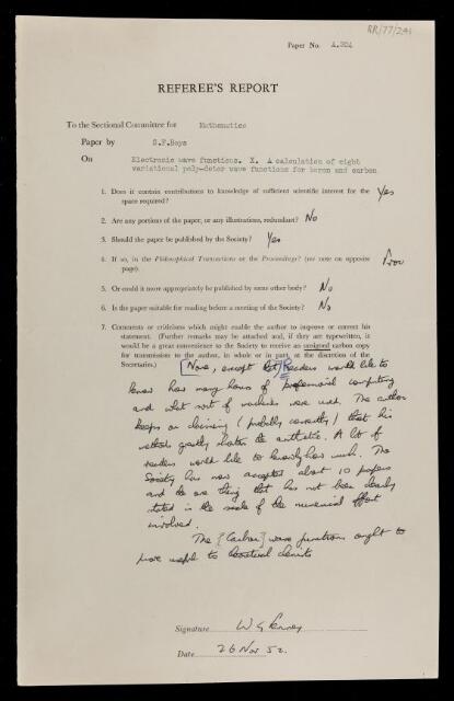 William George Penney, Referee's report by William George Penney, on a paper 'Electronic waves. X. A calculation of eight variational poly-detor wave functions for boron and carbon' by Samuel Francis Boys, 26 November 1952, RR/77/241, The Royal Society Archives, London, https://makingscience.royalsociety.org/items/rr_77_241/referees-report-by-william-george-penney-on-a-paper-electronic-waves-x-a-calculation-of-eight-variational-poly-detor-wave-functions-for-boron-and-carbon-by-samuel-francis-boys, accessed on 08 February 2026