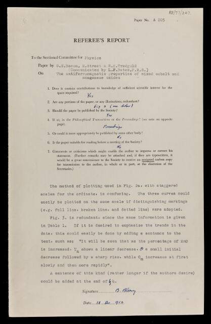 Brebis Bleaney, Referee's report by Brebis Bleaney, on a paper 'The antiferromagnetic properties of mixed cobalt and manganese oxides' by G E Bacon, R Street and R H Tredgold, 18 December 1952, RR/77/242, The Royal Society Archives, London, https://makingscience.royalsociety.org/items/rr_77_242/referees-report-by-brebis-bleaney-on-a-paper-the-antiferromagnetic-properties-of-mixed-cobalt-and-manganese-oxides-by-g-e-bacon-r-street-and-r-h-tredgold, accessed on 21 January 2026