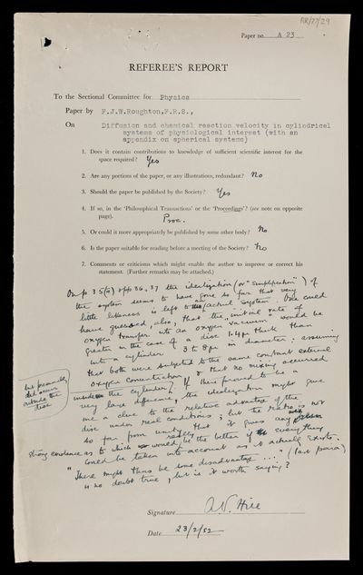 Eric Keightley Rideal, Referee's report by Eric Keightley Rideal, on a paper 'Diffusion and chemical reaction velocity in cylindrical systems of physiological interest (with an appendix of spherical systems)' by Francis John Worsley Roughton, 26 February 1952, RR/77/30, The Royal Society Archives, London, https://makingscience.royalsociety.org/items/rr_77_30/referees-report-by-eric-keightley-rideal-on-a-paper-diffusion-and-chemical-reaction-velocity-in-cylindrical-systems-of-physiological-interest-with-an-appendix-of-spherical-systems-by-francis-john-worsley-roughton, accessed on 12 March 2026