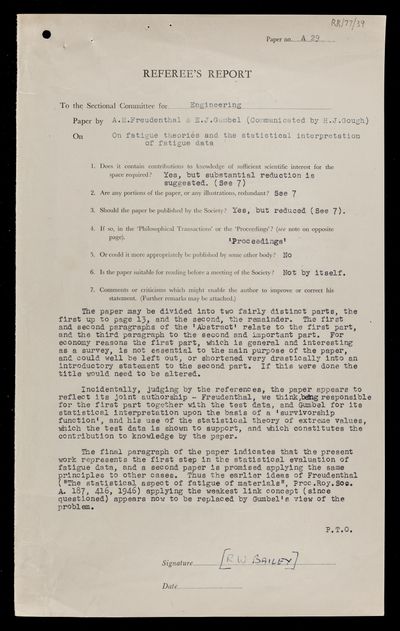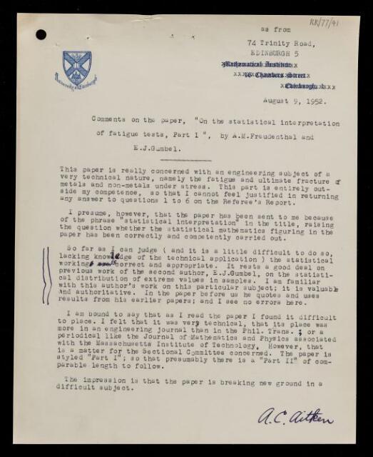 Alexander Craig Aitken, Referee's report by Alexander Craig Aitken, on a paper 'On fatigue theories and the statistical interpretation of fatigue data' by A M Freudenthal and E J Gumbel, 09 August 1952, RR/77/41, The Royal Society Archives, London, https://makingscience.royalsociety.org/items/rr_77_41/referees-report-by-alexander-craig-aitken-on-a-paper-on-fatigue-theories-and-the-statistical-interpretation-of-fatigue-data-by-a-m-freudenthal-and-e-j-gumbel, accessed on 14 March 2026