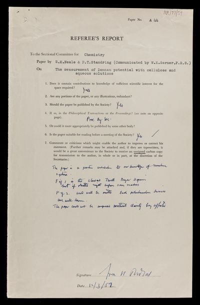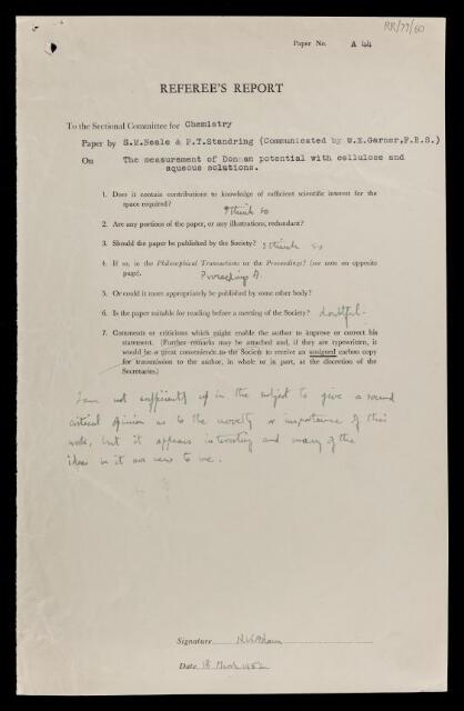 Neil Kensington Adam, Referee's report by Neil Kensington Adam, on a paper 'The measurements of Donnan potential with cellulose and aqueous solutions' by S M Neale and P T Standring, 18 March 1952, RR/77/60, The Royal Society Archives, London, https://makingscience.royalsociety.org/items/rr_77_60/referees-report-by-neil-kensington-adam-on-a-paper-the-measurements-of-donnan-potential-with-cellulose-and-aqueous-solutions-by-s-m-neale-and-p-t-standring, accessed on 06 December 2025