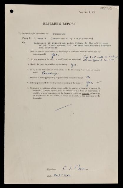 Edmund John Bowen, Referee's report by Edmund John Bowen, on a paper 'Catalysis on evaporated metal films. I. The efficiency of different metals for the reaction between ammonia and deuterium' by Charles Kemball, 31 May 1952, RR/77/86, The Royal Society Archives, London, https://makingscience.royalsociety.org/items/rr_77_86/referees-report-by-edmund-john-bowen-on-a-paper-catalysis-on-evaporated-metal-films-i-the-efficiency-of-different-metals-for-the-reaction-between-ammonia-and-deuterium-by-charles-kemball, accessed on 10 November 2025