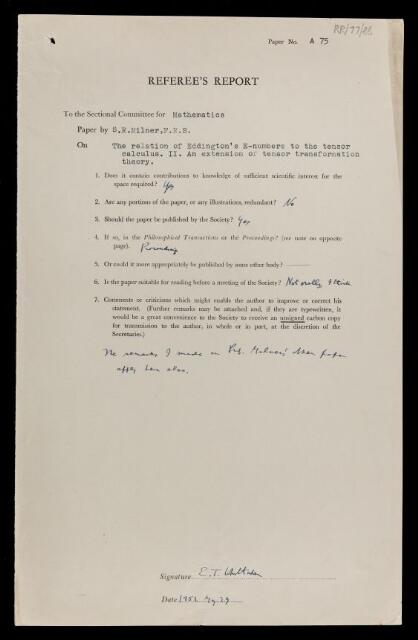 Edmund Taylor Whittaker, Referee's report by Edmund Taylor Whittaker, on a paper 'The reaction of Eddington's E-numbers to the tensor calculus. II. An extension of tensor transformation theory' by Samuel Roslington Milner, 29 May 1952, RR/77/88, The Royal Society Archives, London, https://makingscience.royalsociety.org/items/rr_77_88/referees-report-by-edmund-taylor-whittaker-on-a-paper-the-reaction-of-eddingtons-e-numbers-to-the-tensor-calculus-ii-an-extension-of-tensor-transformation-theory-by-samuel-roslington-milner, accessed on 07 November 2025