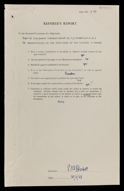 Patrick Maynard Stuart Blackett, Letter from Patrick Maynard Stuart Blackett, on a paper 'Observations on the life-time of the neutral π-meson' by B M Anand, to D C Martin, 21 May 1953, RR/79/101, The Royal Society Archives, London, https://makingscience.royalsociety.org/items/rr_79_101/letter-from-patrick-maynard-stuart-blackett-on-a-paper-observations-on-the-life-time-of-the-neutral-π-meson-by-b-m-anand-to-d-c-martin, accessed on 06 December 2025