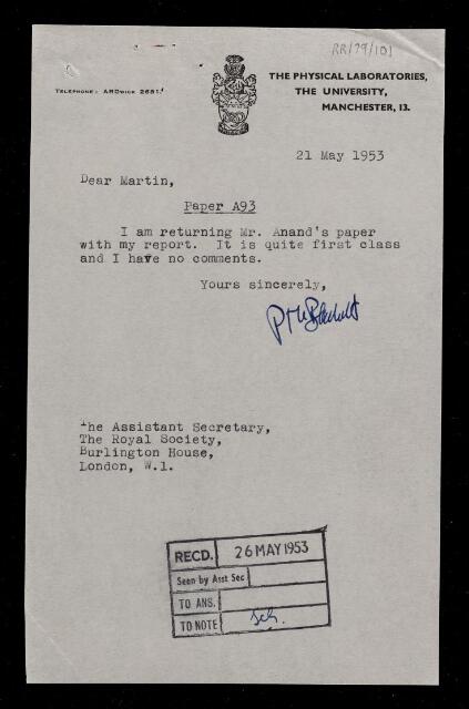 Blackett writes: 'Dear Martin, Paper A93. I am returning Mr. Anand's paper with my report. It is quite first class and I have no comments. Yours sincerely, P M S Blackett'.