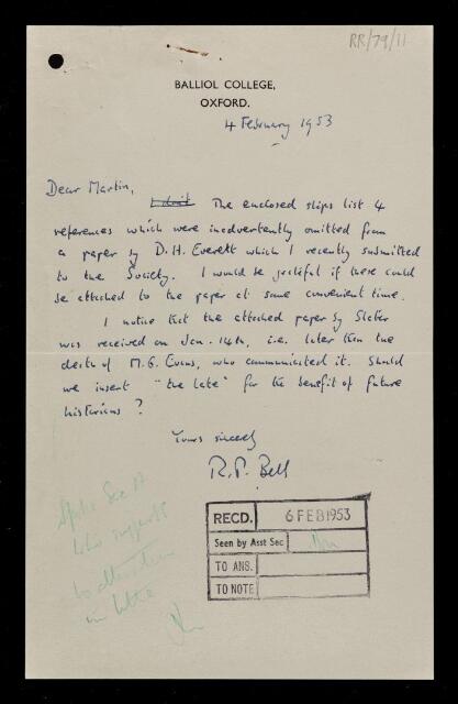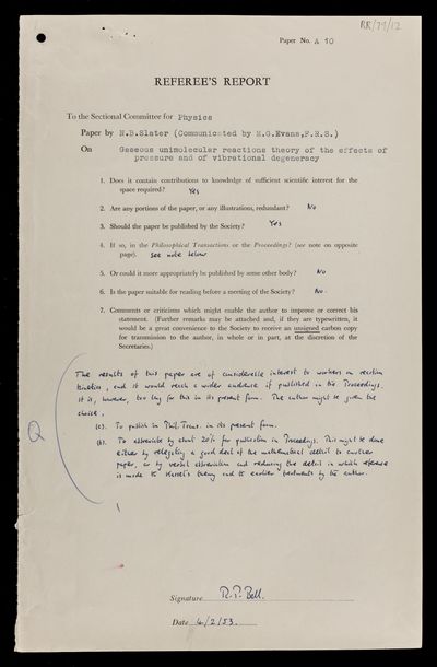 Ronald Percy Bell, Letter from Ronald Percy Bell, on a paper 'Gaseous unimolecular reactions theory of the effects of pressure and of vibrational degeneracy' by N B Slater, to D C Martin, 04 February 1953, RR/79/11, The Royal Society Archives, London, https://makingscience.royalsociety.org/items/rr_79_11/letter-from-ronald-percy-bell-on-a-paper-gaseous-unimolecular-reactions-theory-of-the-effects-of-pressure-and-of-vibrational-degeneracy-by-n-b-slater-to-d-c-martin, accessed on 10 December 2025