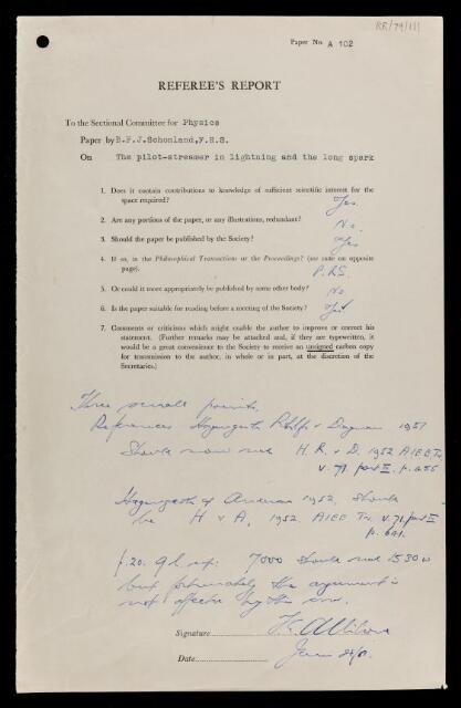 Thomas Edward Allibone, Referee's report by Thomas Edward Allibone, on a paper 'The pilot-streamer in lightning and the long spark' by Basil Ferdinand Jamieson Schonland, 28 January 1953, RR/79/111, The Royal Society Archives, London, https://makingscience.royalsociety.org/items/rr_79_111/referees-report-by-thomas-edward-allibone-on-a-paper-the-pilot-streamer-in-lightning-and-the-long-spark-by-basil-ferdinand-jamieson-schonland, accessed on 15 January 2026