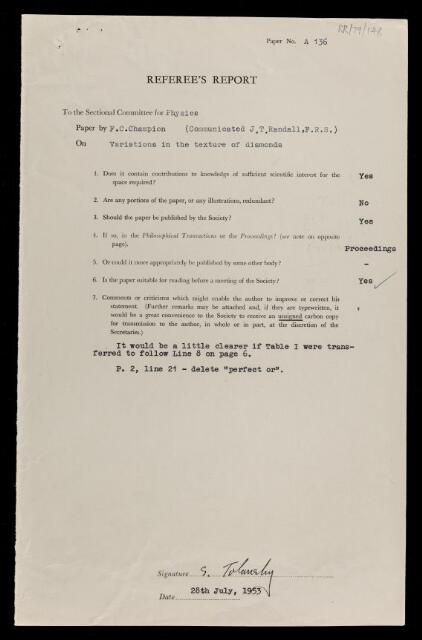 Samuel Tolansky, Referee's report by Samuel Tolansky, on a paper 'Variations in the texture of diamonds' by F C Champion, 28 July 1953, RR/79/148, The Royal Society Archives, London, https://makingscience.royalsociety.org/items/rr_79_148/referees-report-by-samuel-tolansky-on-a-paper-variations-in-the-texture-of-diamonds-by-f-c-champion, accessed on 15 November 2025