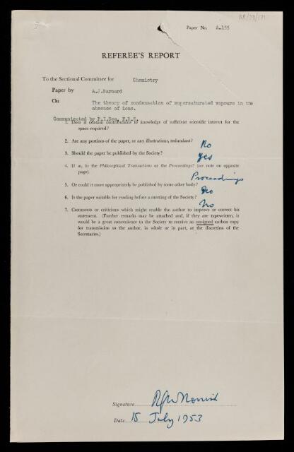 Ronald George Wreyford Norrish, Referee's report by Ronald George Wreyford Norrish, on paper 'The theory of condensation of supersaturated vapours in the absence of ions' by A J Barnard, 15 July 1953, RR/79/171, The Royal Society Archives, London, https://makingscience.royalsociety.org/items/rr_79_171/referees-report-by-ronald-george-wreyford-norrish-on-paper-the-theory-of-condensation-of-supersaturated-vapours-in-the-absence-of-ions-by-a-j-barnard, accessed on 17 January 2026
