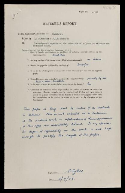 Charles Sykes, Referee's report by Charles Sykes, on a paper 'Thermodynamic aspects of the behaviour of sulphur in silicate and aluminate melts' by C J B Fincham and Frederick Denys Richardson, 02 September 1953, RR/79/176, The Royal Society Archives, London, https://makingscience.royalsociety.org/items/rr_79_176/referees-report-by-charles-sykes-on-a-paper-thermodynamic-aspects-of-the-behaviour-of-sulphur-in-silicate-and-aluminate-melts-by-c-j-b-fincham-and-frederick-denys-richardson, accessed on 05 December 2025