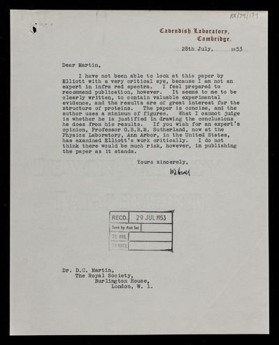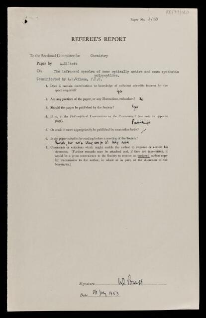 William Lawrence Bragg, Referee's report by Sir William Lawrence Bragg, on a paper 'The infra-red spectra of some optically active and meso synthetic polypeptides' by A Elliott, 28 July 1953, RR/79/180, The Royal Society Archives, London, https://makingscience.royalsociety.org/items/rr_79_180/referees-report-by-sir-william-lawrence-bragg-on-a-paper-the-infra-red-spectra-of-some-optically-active-and-meso-synthetic-polypeptides-by-a-elliott, accessed on 08 February 2026