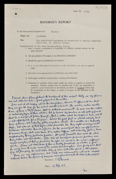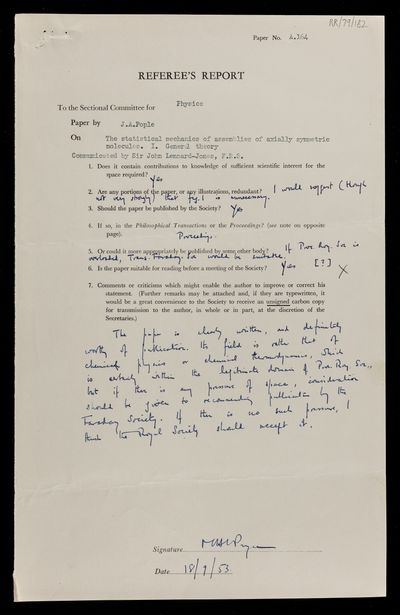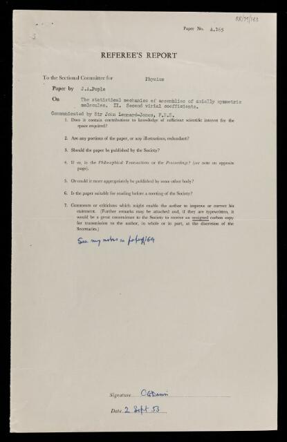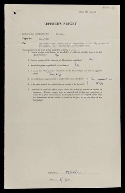 Charles Galton Darwin, Referee's report by Charles Galton Darwin, on a paper 'The statistical mechanics of assemblies of axially symmetric molecules. II. Second virial coefficients' by John Anthony Pople, 02 September 1953, RR/79/183, The Royal Society Archives, London, https://makingscience.royalsociety.org/items/rr_79_183/referees-report-by-charles-galton-darwin-on-a-paper-the-statistical-mechanics-of-assemblies-of-axially-symmetric-molecules-ii-second-virial-coefficients-by-john-anthony-pople, accessed on 23 January 2026