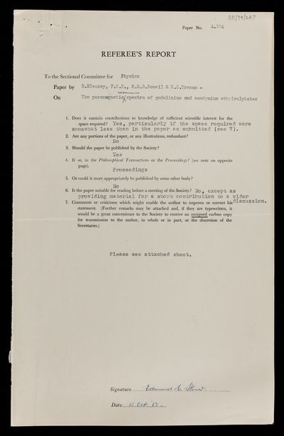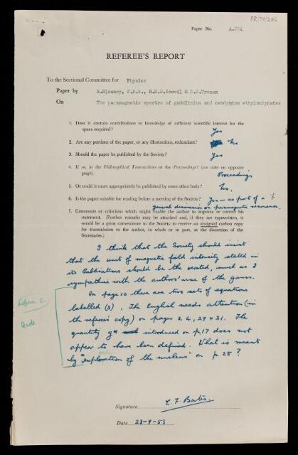 Leslie Fleetwood Bates, Referee's report by Leslie Fleetwood Bates, on a paper 'The paramagnetic spectra of gadolinium and neodymium ethylsulphates' by Brebis Bleaney, H E D Scovil and R S Trenam, 23 September 1953, RR/79/246, The Royal Society Archives, London, https://makingscience.royalsociety.org/items/rr_79_246/referees-report-by-leslie-fleetwood-bates-on-a-paper-the-paramagnetic-spectra-of-gadolinium-and-neodymium-ethylsulphates-by-brebis-bleaney-h-e-d-scovil-and-r-s-trenam, accessed on 18 April 2026
