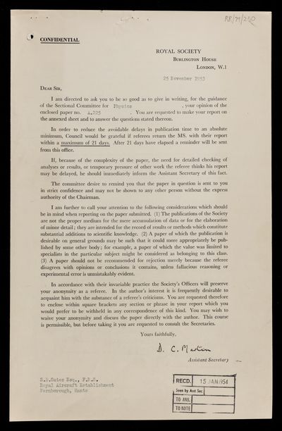 Referees' reports on scientific papers submitted to the Royal Society for publication