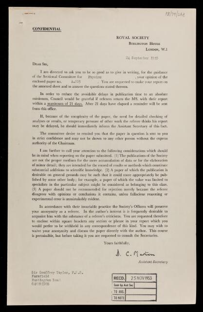 Geoffrey Ingram Taylor, Referee's report by Geoffrey Ingram Taylor, on a paper 'A photographic investigation into the disintegration of liquid sheets' by N Dombrowski and R P Fraser, 22 November 1953, RR/79/248, The Royal Society Archives, London, https://makingscience.royalsociety.org/items/rr_79_248/referees-report-by-geoffrey-ingram-taylor-on-a-paper-a-photographic-investigation-into-the-disintegration-of-liquid-sheets-by-n-dombrowski-and-r-p-fraser, accessed on 24 January 2026