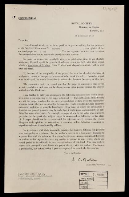 Sidney Barrington Gates, Referee's report by Sidney Barrington Gates, on a paper 'A photographic investigation into the disintegration of liquid sheets' by N Dombrowski and R P Fraser, 07 January 1954, RR/79/250, The Royal Society Archives, London, https://makingscience.royalsociety.org/items/rr_79_250/referees-report-by-sidney-barrington-gates-on-a-paper-a-photographic-investigation-into-the-disintegration-of-liquid-sheets-by-n-dombrowski-and-r-p-fraser, accessed on 15 December 2025