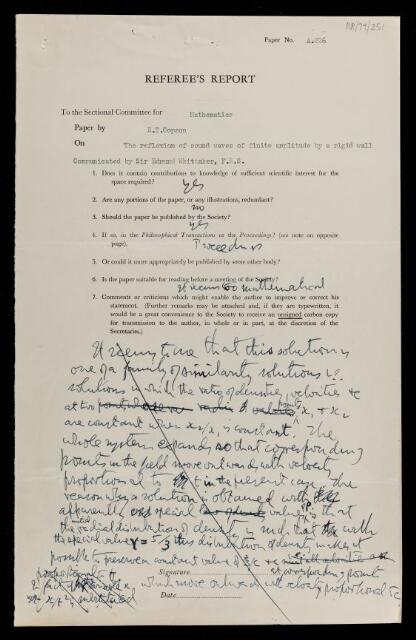 Geoffrey Ingram Taylor, Referee's report by Geoffrey Ingram Taylor, on a paper 'The reflexion of sound waves of finite amplitude by a rigid wall' by E T Copson, 25 September 1953, RR/79/251, The Royal Society Archives, London, https://makingscience.royalsociety.org/items/rr_79_251/referees-report-by-geoffrey-ingram-taylor-on-a-paper-the-reflexion-of-sound-waves-of-finite-amplitude-by-a-rigid-wall-by-e-t-copson, accessed on 17 January 2026
