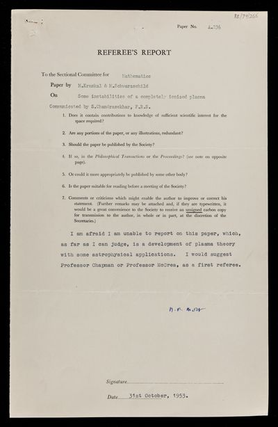 Geoffrey Ingram Taylor, Referee's report by Geoffrey Ingram Taylor, on a paper 'Some instabilities of a completely ionised plasma' by Martin David Kruskal and Martin Schwarzschild, 27 October 1953, RR/79/265, The Royal Society Archives, London, https://makingscience.royalsociety.org/items/rr_79_265/referees-report-by-geoffrey-ingram-taylor-on-a-paper-some-instabilities-of-a-completely-ionised-plasma-by-martin-david-kruskal-and-martin-schwarzschild, accessed on 15 February 2026