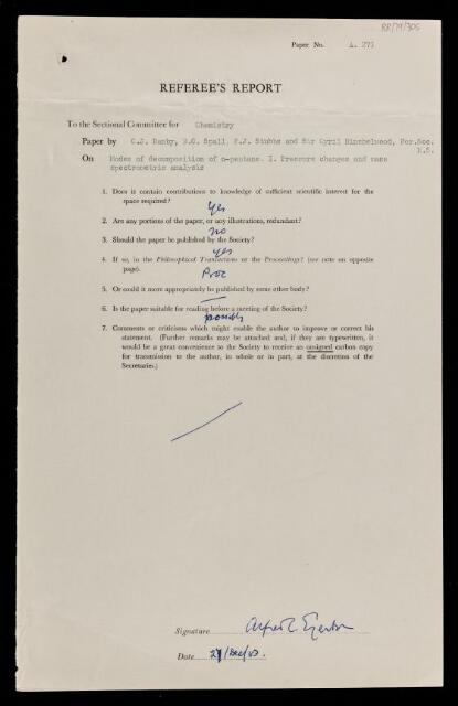 Alfred Charles Glyn Egerton, Referee's report by Alfred Charles Glyn Egerton, on a paper 'Modes of decomposition of n-pentane. I. Pressure changes and mass spectrometric analysis' by C J Danby, B C Spall, F J Stubbs and Cyril Norman Hinshelwood, 27 December 1953, RR/79/305, The Royal Society Archives, London, https://makingscience.royalsociety.org/items/rr_79_305/referees-report-by-alfred-charles-glyn-egerton-on-a-paper-modes-of-decomposition-of-n-pentane-i-pressure-changes-and-mass-spectrometric-analysis-by-c-j-danby-b-c-spall-f-j-stubbs-and-cyril-norman-hinshelwood, accessed on 06 December 2025