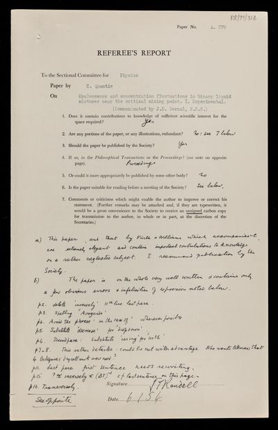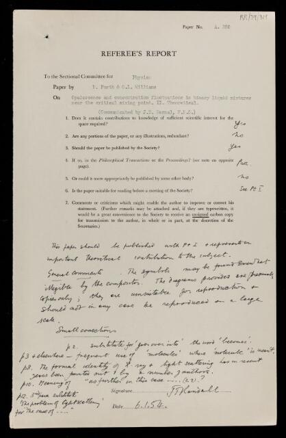John Turton Randall, Referee's report by John Turton Randall, on a paper 'Opalescence and concentration fluctuations in binary liquid mixtures near the critical mixing point. II. Theoretical' by R Furth and C L Williams, 06 January 1954, RR/79/319, The Royal Society Archives, London, https://makingscience.royalsociety.org/items/rr_79_319/referees-report-by-john-turton-randall-on-a-paper-opalescence-and-concentration-fluctuations-in-binary-liquid-mixtures-near-the-critical-mixing-point-ii-theoretical-by-r-furth-and-c-l-williams, accessed on 10 December 2025