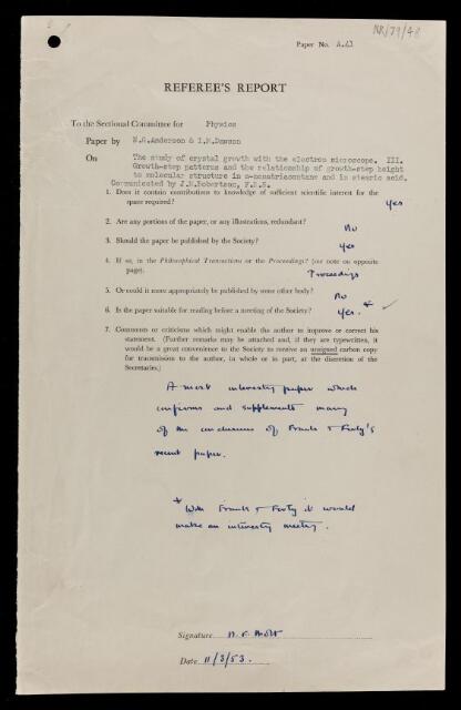 Nevill Francis Mott, Referee's report by Nevill Francis Mott, on a paper 'The study of crystal growth with the electron microscope. III. Growth-step patterns and the relationship of growth-step height to molecular structure in n-nonatriacontane and in stearic acid' by N G Anderson and I M Dawson, 11 March 1953, RR/79/48, The Royal Society Archives, London, https://makingscience.royalsociety.org/items/rr_79_48/referees-report-by-nevill-francis-mott-on-a-paper-the-study-of-crystal-growth-with-the-electron-microscope-iii-growth-step-patterns-and-the-relationship-of-growth-step-height-to-molecular-structure-in-n-nonatriacontane-and-in-stearic-acid-by-n-g-anderson-and-i-m-dawson, accessed on 10 February 2026