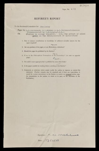 Cyril Norman Hinshelwood, Referee's report by Cyril Norman Hinshelwood, on a paper 'Studies in energy transfer. III. The effect of added gases on the decomposition of cyclobutane' by H O Pritchard, R G Sowden and A F Trotman-Dickenson, 27 March 1953, RR/79/69, The Royal Society Archives, London, https://makingscience.royalsociety.org/items/rr_79_69/referees-report-by-cyril-norman-hinshelwood-on-a-paper-studies-in-energy-transfer-iii-the-effect-of-added-gases-on-the-decomposition-of-cyclobutane-by-h-o-pritchard-r-g-sowden-and-a-f-trotman-dickenson, accessed on 22 January 2026