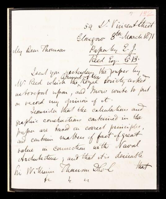 William John Macquorn Rankine, William Thomson, Referee's report by William John Macquorn Rankine and William Thomson, Lord Kelvin, on a paper 'On the unequal distribution of weight and support in ships, and its effects in still water, in waves, and in exceptional positions on shore' by Edward James Reed, 08 March 1871, RR/7/132, The Royal Society Archives, London, https://makingscience.royalsociety.org/items/rr_7_132/referees-report-by-william-john-macquorn-rankine-and-william-thomson-lord-kelvin-on-a-paper-on-the-unequal-distribution-of-weight-and-support-in-ships-and-its-effects-in-still-water-in-waves-and-in-exceptional-positions-on-shore-by-edward-james-reed, accessed on 08 February 2026
