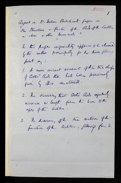 John Whitaker Hulke, Referee's report by John Whitaker Hulke, on a paper 'On the structure and function of the rods of the cochlea in man and other mammals' by Urban Pritchard, 02 August 1872, RR/7/200, The Royal Society Archives, London, https://makingscience.royalsociety.org/items/rr_7_200/referees-report-by-john-whitaker-hulke-on-a-paper-on-the-structure-and-function-of-the-rods-of-the-cochlea-in-man-and-other-mammals-by-urban-pritchard, accessed on 16 February 2026