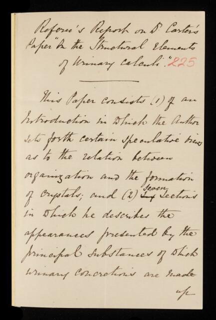 John Scott Burdon-Sanderson, Referee's report by John Scott Burdon-Sanderson, on a paper 'Structural elements of urinary calculi' by Henry John Carter, 1873, RR/7/225, The Royal Society Archives, London, https://makingscience.royalsociety.org/items/rr_7_225/referees-report-by-john-scott-burdon-sanderson-on-a-paper-structural-elements-of-urinary-calculi-by-henry-john-carter, accessed on 11 November 2025