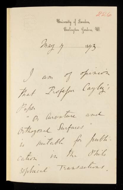 Henry John Stephen Smith, Referee's report by Henry John Stephen Smith, on a paper 'On curvature and orthogonal surfaces' by Arthur Cayley, 17 May 1873, RR/7/226, The Royal Society Archives, London, https://makingscience.royalsociety.org/items/rr_7_226/referees-report-by-henry-john-stephen-smith-on-a-paper-on-curvature-and-orthogonal-surfaces-by-arthur-cayley, accessed on 05 December 2025