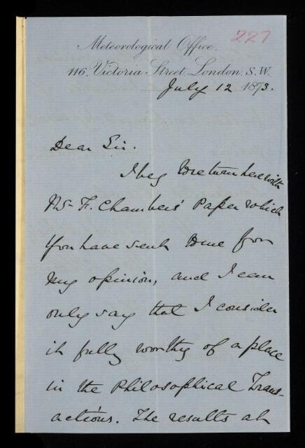 Robert Henry Scott, Referee's report by Robert Henry Scott, on a paper 'The diurnal variations of the wind and barometric pressure at Bombay' by F Chambers, 12 July 1873, RR/7/227, The Royal Society Archives, London, https://makingscience.royalsociety.org/items/rr_7_227/referees-report-by-robert-henry-scott-on-a-paper-the-diurnal-variations-of-the-wind-and-barometric-pressure-at-bombay-by-f-chambers, accessed on 10 December 2025