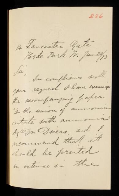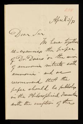 Edward Frankland, Referee's report by Edward Frankland, on a paper 'On the union of ammonia nitrate with ammonia' by Edward Divers, 20 January 1873, RR/7/236, The Royal Society Archives, London, https://makingscience.royalsociety.org/items/rr_7_236/referees-report-by-edward-frankland-on-a-paper-on-the-union-of-ammonia-nitrate-with-ammonia-by-edward-divers, accessed on 09 February 2026