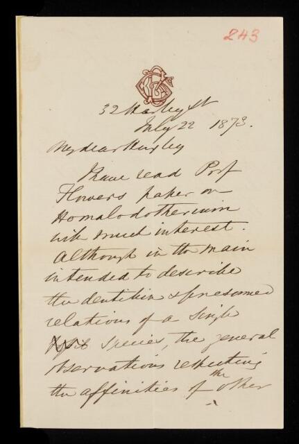 George Busk, Referee's report by George Busk, on a paper 'On a newly discovered extinct ungulate mammal from Patagonia, homalodonto-therium cunninghami' by William Henry Flower, 22 May 1873, RR/7/243, The Royal Society Archives, London, https://makingscience.royalsociety.org/items/rr_7_243/referees-report-by-george-busk-on-a-paper-on-a-newly-discovered-extinct-ungulate-mammal-from-patagonia-homalodonto-therium-cunninghami-by-william-henry-flower, accessed on 08 March 2026
